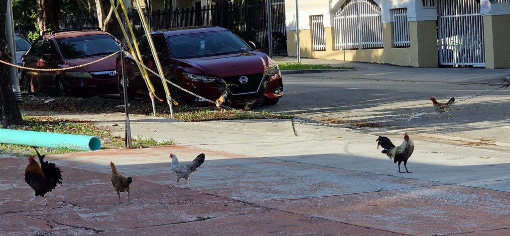 Dès notre arrivée à Miami, nous avons été surpris par ces poules un peu trop maigres pour être mises sur la broche et ces magnifiques coqs au panache coloré. ‘Ils se sont échappés d’une basse-cour’ dis-je alors à Lina.